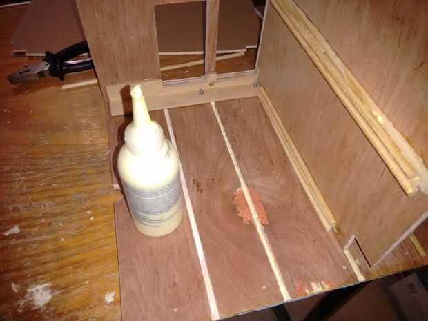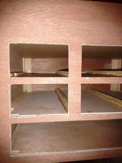 Cada base de cajón fue recortada en cada esquina se adapte correctamente debido la Plaza esquina de moldeo y palos de madera fueron adheridos a cada base para actuar como una gaveta deslizante restricción para evitar mislocations de cajón.