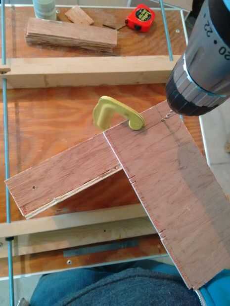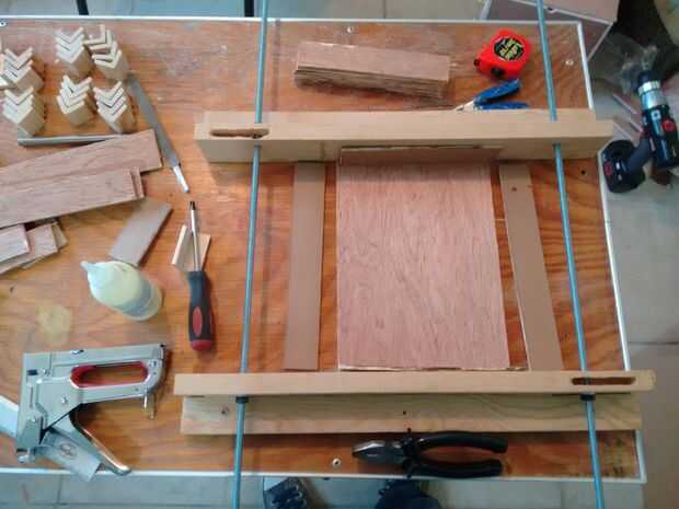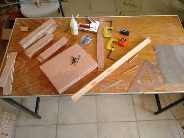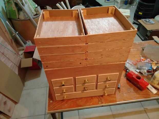 Una vez que se cortaron todas las piezas, usé otra vez la prensa/plantilla personalizada para ayudar a la construcción, cada base de cajón fue asegurada con pegamento y grapas utilizando una grapadora manual y cada esquina fue asegurado con las secciones de moldeo de esquina y después reforzado con tornillos, tuercas y arandelas M3.