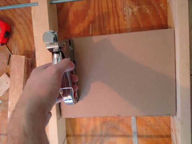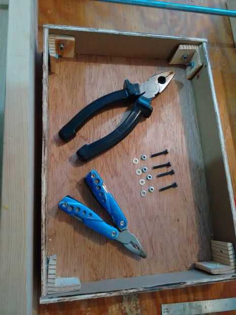 Los agujeros para los tornillos de M3 se hicieron con la ayuda de una plantilla para taladrar que consisten en una madera del pedazo o que se midió y perforada por conveniencia para localizar rápidamente la ubicación del agujero en el lado del cajón.
