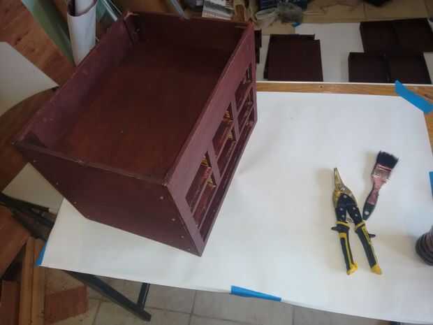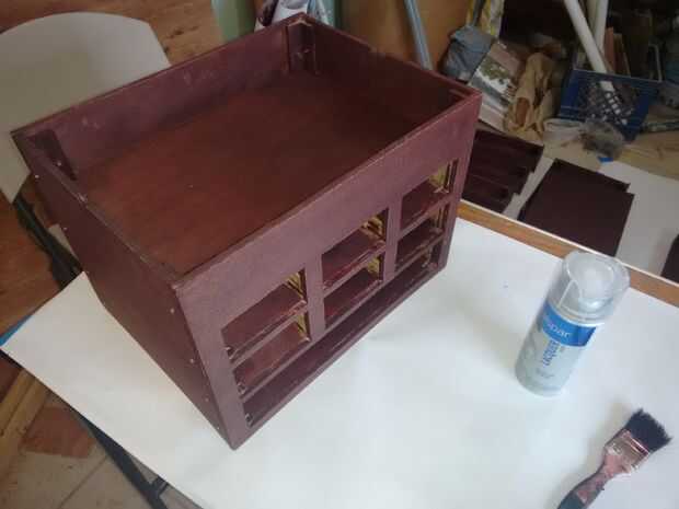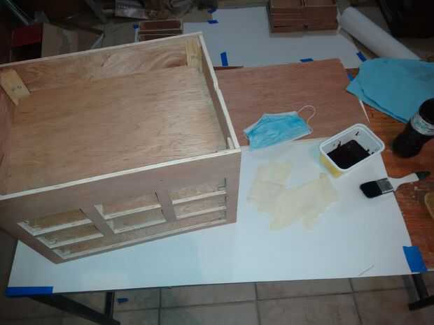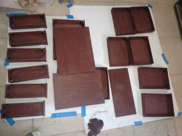 Todas las piezas de madera de este proyecto fueron pintadas, aplicar la primera mancha con un cepillo y frotar el exceso de tinte con un trapo. Al principio cuando estaba manchada la madera era muy oscuro y opaco, entonces yo estaba preocupada porque no veía bien, pero una vez que se aplicó la primera capa de realzado, subió el color y en un tono vintage de palo de rosa brillante y elegante.