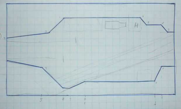 Usé papel milimetrado para dibujar hacia fuera la cubierta de vuelo más grande que podría hacer usando las hojas de cartulina disponibles. Utilizando una regla y lápiz, dibujaba y cortar una copia de la cubierta de vuelo, luego utiliza para trazar y cortar otra copia. El cartón que utilicé fue doble grosor, así que hay un total de cuatro capas en mi cubierta de vuelo. Usé pegamento de madera para sellar las dos capas juntas.