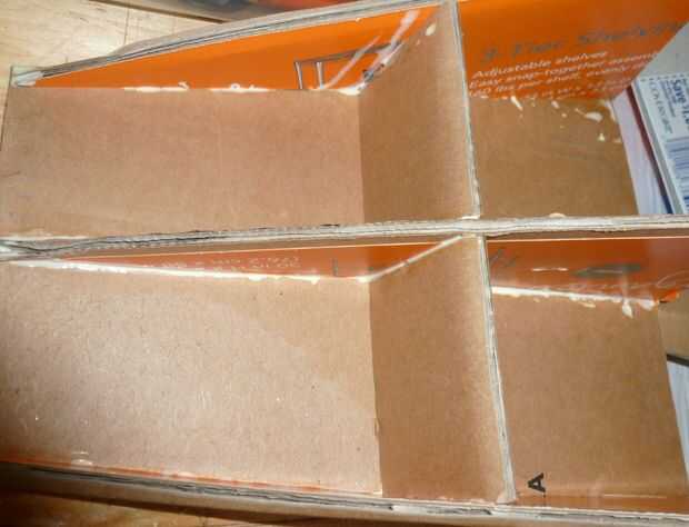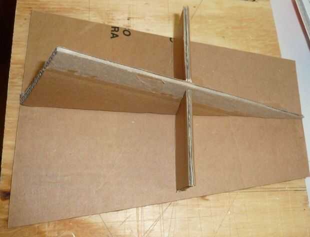 Un trozo de tablero de la etiqueta (tomada desde la esquina de una caja de cereal) se utiliza para conectar la boquilla a la parte inferior de la cubierta de vuelo. Los bordes de la cartulina no pega muy bien, usé la etiqueta junta con algún pegamento de madera como si fuera cinta que sostiene la boquilla a la cubierta de vuelo.