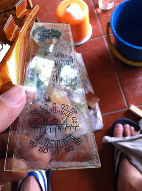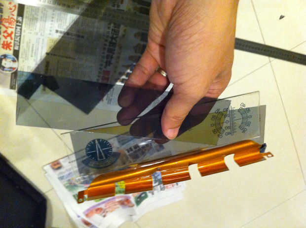 Después de haber extraído la mayor parte de la cola. Usé algunos Autosol pulidora para eliminar completamente la mancha de pegamento. Hacerlo suavemente no para romper el cristal de pantalla LCD. Puse la pantalla de vidrio sobre un pedazo de madera suave como material del forro. Después el pegamento se ha eliminado, cortar dos películas polarizador según el tamaño del panel LCD. Asegúrese de que la orientación de estos dos polarizadores se cruzan entre sí. Coloque el polarizador (en la parte posterior de la pantalla) y analizador (delante de la pantalla de LCD) en la pantalla LCD. Yo sólo clip les juntos mecánicamente, pero también se pueden utilizar algunos spot pegamento epoxi de curado rápida las películas polarizador en el borde de la pantalla de cristal. Vuelva a montar el medidor de pantalla Multi información.