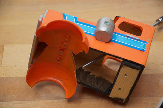 Los guardabarros están hechos de una botella de refresco de 0,5 L. Corte el redondo de abajo y luego dividir la botella en dos partes según la línea punteada. Luego puede pega y fija con los tornillos a la capota. Para ello, necesita pegar una pieza sólida de madera interior de la campana para los tornillos de escarbar. Esto también reforzará la cabina entera. Cuadro Nº 2 muestra la construcción. También se puede ver un pedazo extra de madera en el extremo posterior de la cabina. Es para la fijación de la cabina a la distancia entre ejes. Esta pieza tiene que sobresalir un poco para dar la distancia correcta a la base de la rueda. Pegue en la cabina justo antes monta todo el asunto. Así, asegúrese de que, todo encaja y las ruedas no chocan en cualquier lugar. No hago dibujos exactos de las partes, porque el resultado final a menudo resulta un poco más grande o más pequeño, de lo esperado. Para ello tienes que tomar la medida del resultado final y con mucha precisión la forma - esto le dará el carro la mejor fuerza...