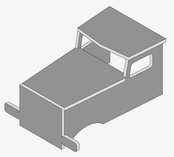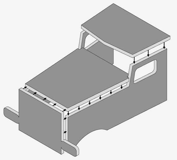 Cuando se han cortado todas las piezas, es momento de unir todas las cosas. Si cortar las piezas con bastante precisión, debería ser bastante obvio lo que va donde. Se pegan las piezas cabina borde a borde sin clavos ni tornillos más, para ello los bordes tienen que ser muy preciso y recto lo contrario la conexión no será lo suficientemente fuerte. Puede que tenga que lijar o cepillar los bordes antes de pegar para asegurar ajuste perfecto...
