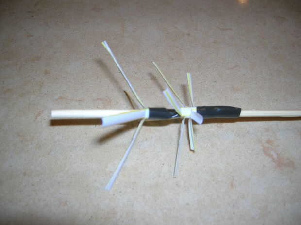 Ahora, la cinta el primer extremo de la pajilla con un muy pequeño pedazo de cinta como se muestra. a continuación, suelte el gran segmento del segmento principal y cinta como cerca el segmento principal como sea posible con un trozo muy pequeño de la cinta, otra vez, como se muestra. Después, doblar que la cola de nuevo para hacer un efecto de"pluma".