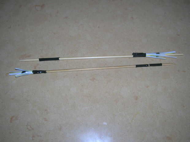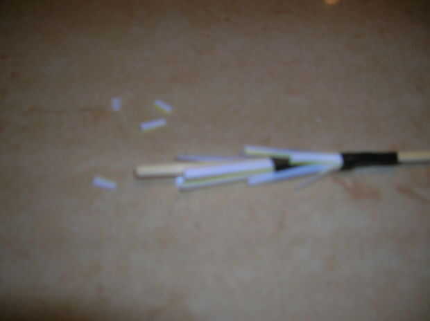 Nota: si que usted encontrar que el dardo no volar recto como pensamiento, tomar pequeños trozos de cinta y ponerlos cerca del punto en el lado opuesto de la brocheta para ayudar a estabilizar la flecha un poco más.