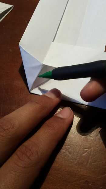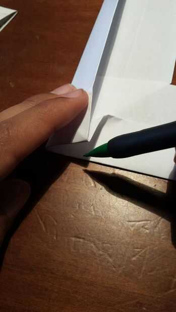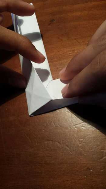 OK, ahora, respira profundo porque este es el paso más largo. doble la parte inferior dlap hacia abajo primero, apriete el borde del triángulo para que haya un pliegue que quede frente a usted. Esto creará un pequeño triángulo que solo puede ignorar por ahora. A continuación se debe doblar en la pierna vertical. La izquierda sobre papel debe ser doblada para que cree un triángulo que apunta en la cima del interior triángulo. Ahora la pierna inferior debe también tomar pulgadas doblado el vértice inferior del triángulo y meta como se muestra. Ahora aplana todo. Asegúrese de no hacer cualquier arrugas no deseadas. ¡ Buen trabajo! han pasado la parte más difícil.