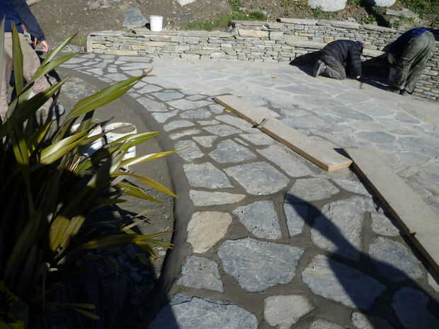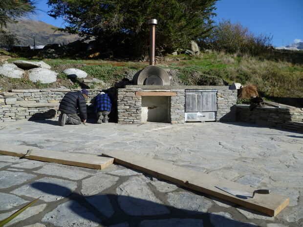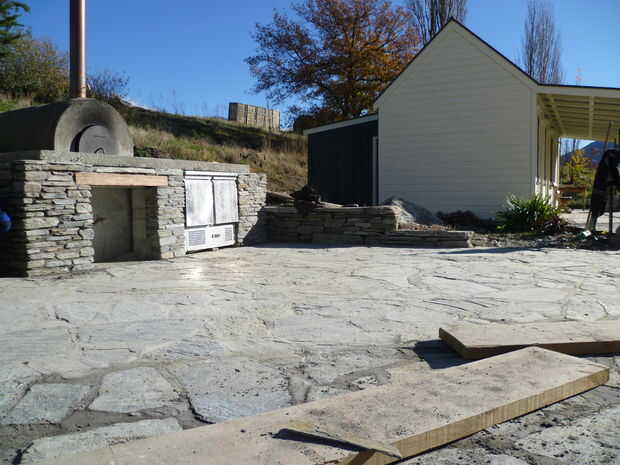 Pavimentos de piedra natural en tierra. Trabajo de chapa alrededor de horno de pizza. Paredes y estar en seco piedra con argamasa en mantenerlos sólidos superior losas.