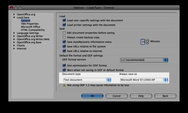 Otra cosa que me ayuda enormemente es que se puede definir OOo siempre guardar documentos de texto como archivos .doc de Microsoft Word. Sí, los estándares abiertos como OpenDocument son siempre mejores y totalmente libre de culpa, pero el hecho es que la mayoría de la gente apuntan a Microsoft Office y si usted planea enviar sus archivos a ellos, la vida será mucho más fácil si usted está todos hablando el mismo idioma.