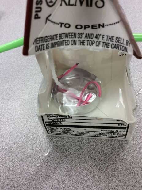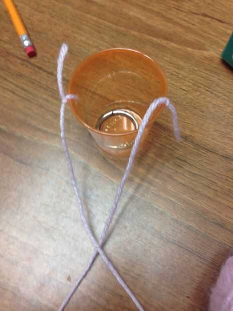 Su cubo tendrá asas para sujetar al eje de la manivela. En nuestro modelo, primero se perfora agujeros en los lados de la Copa con una perforadora. Luego atamos 2 pedazos de cuerda, uno en cada agujero. Cadena era aproximadamente 5" de longitud. Si está utilizando un pequeño cartón de leche y una tapa de pegamento, perforar los costados de la tapa del pegamento con una aguja de zurcir. (Esto es una aguja más gruesa que uno que utilizaría para coser un botón). Luego utilice un clip de papel abierto a un mango.