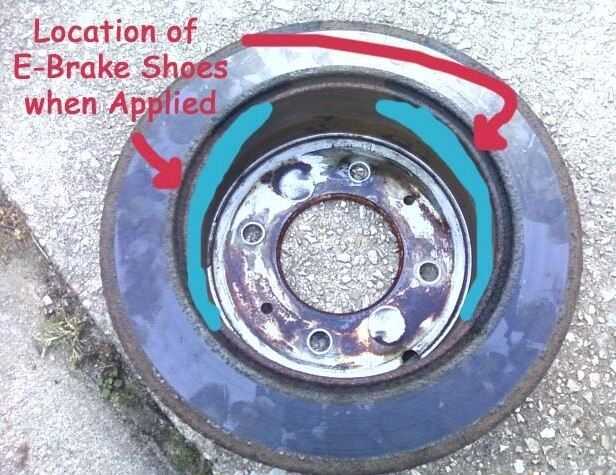 7) esto es lo que parece cuando se quita el rotor. E-brake es un freno mecánico, que se tira los zapatos de sombra azul contra el interior de la parte de "el tambor" del disco trasero. Pueden conseguir pegados, u oxidados un poco, tan a la ligera toque el tambor y la parte trasera del rotor con un martillo o mazo de goma. Hay un ojal de goma que cubre el Ajustador de freno e si usted realmente necesita para volver a marcar el freno e, y puedes hacer una copia de la tuerca del cable bajo la consola central.