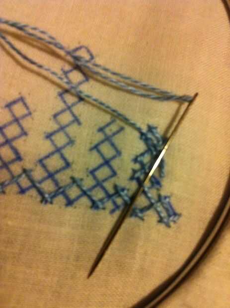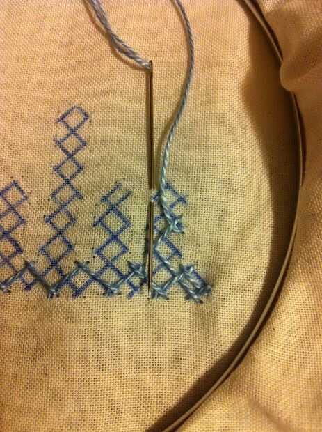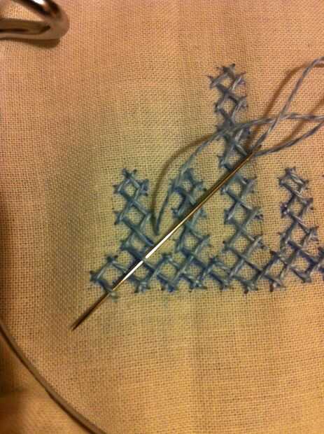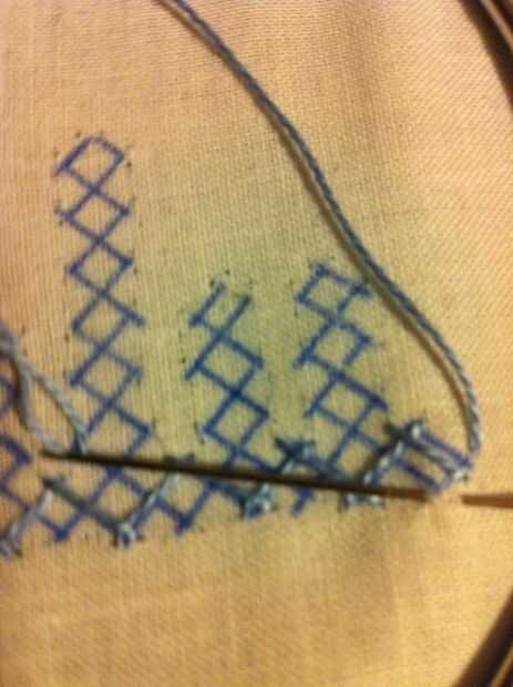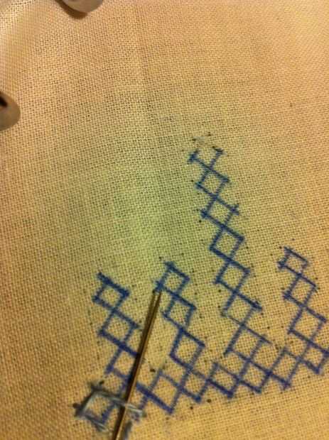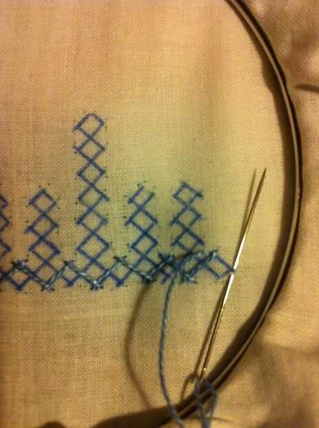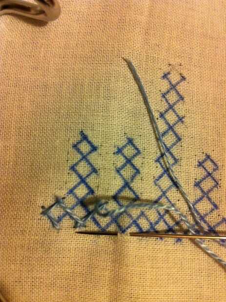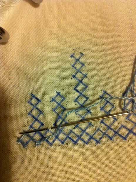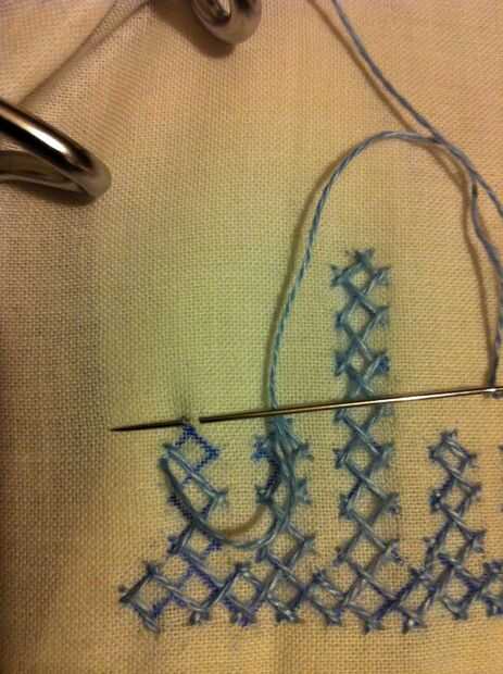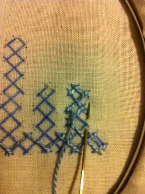 Nota: Cuando usted mira las imágenes, parece fácil, pero no es así. Tiene que haber mucha concentración en cómo los puntos de sutura. Si haces un mal movimiento en el paso de la aguja más/menos, más tarde no será capaz de hacer el entrelazado. Entonces tienes que quitar toda la puntadas y re empezar.