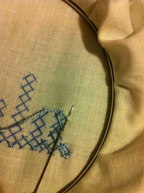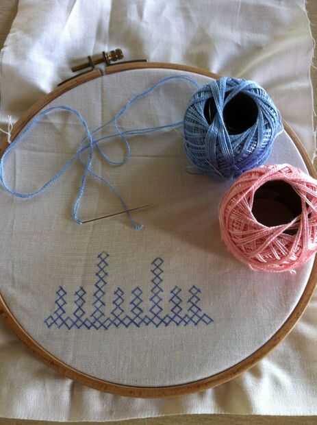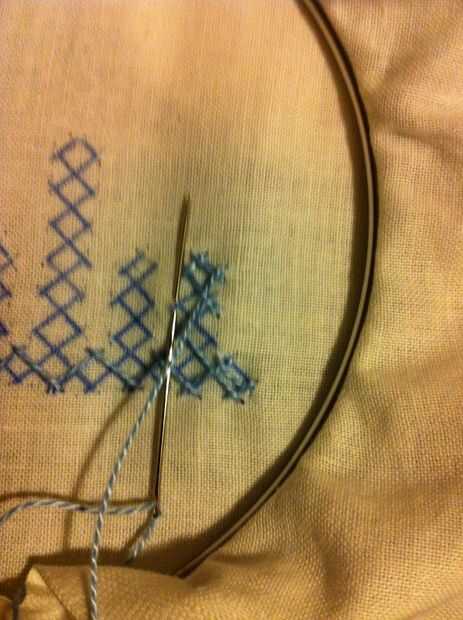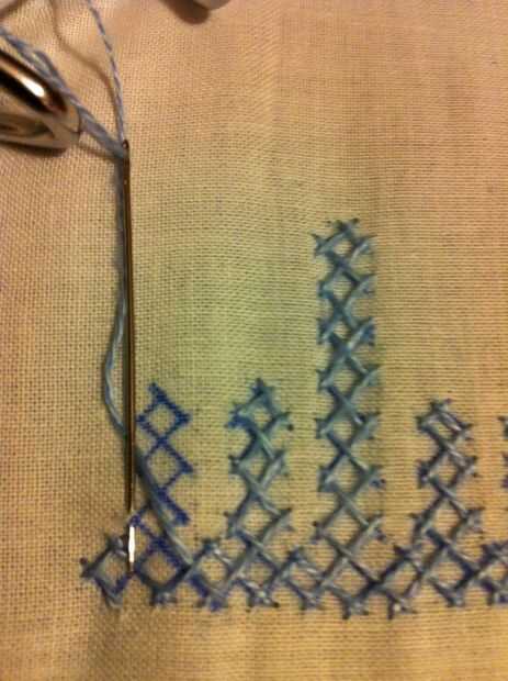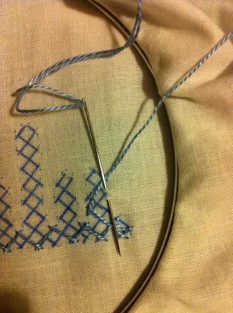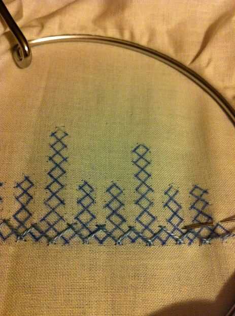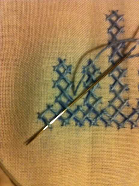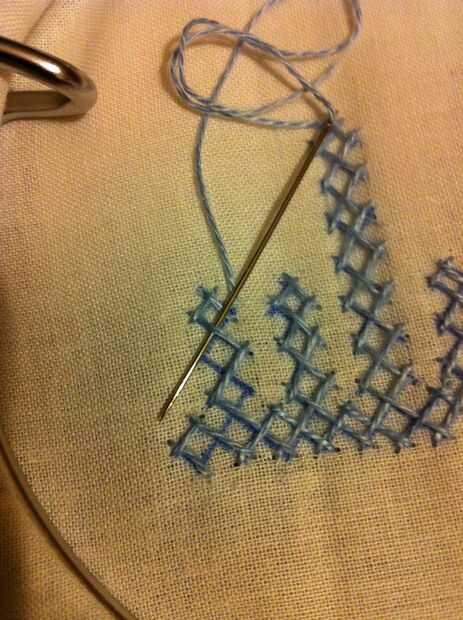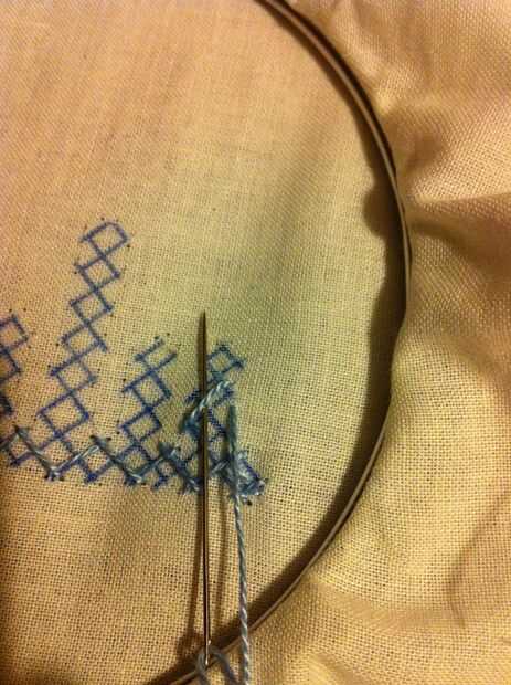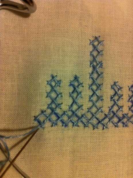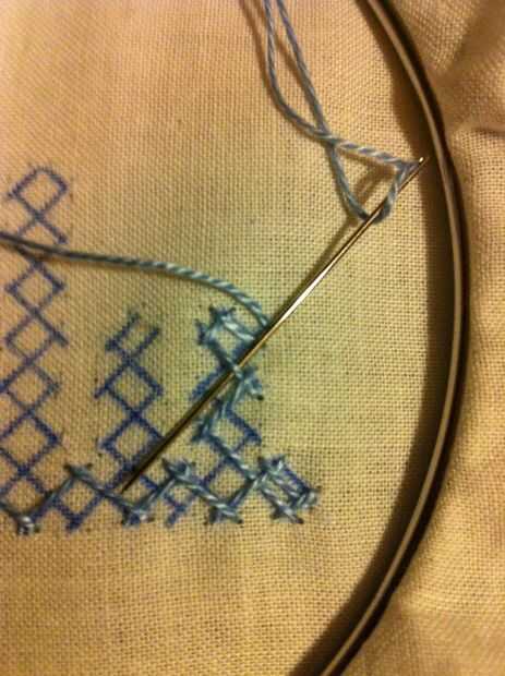 Nota: Cuando usted mira las imágenes, parece fácil, pero no es así. Tiene que haber mucha concentración en cómo los puntos de sutura. Si haces un mal movimiento en el paso de la aguja más/menos, más tarde no será capaz de hacer el entrelazado. Entonces tienes que quitar toda la puntadas y re empezar.