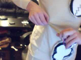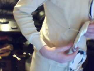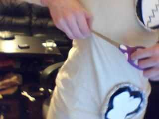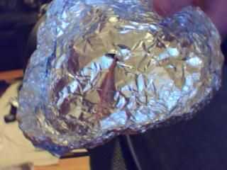 Haga un orificio en la lámina en el centro y tira una cantidad sólida de blindar el alambre que usas para él. Fray los cables de modo que obtiene una buena cobertura y se sellen con cinta aislante. (Yo no quería hacer ninguna soldadura en este traje). (Así, asegúrese de que el cable sea suficientemente largo o más largo que requiere para llegar a su cadera, con espacio para moverse.)