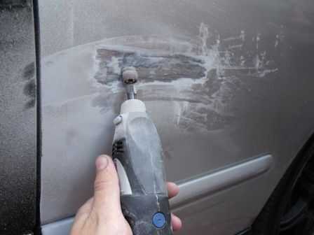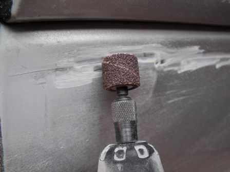 Ahora si tienes que llenar un hueco lo primero que tienes que hacer es de arena hasta llegar a la parte metálica alrededor de la abolladura para obtener de 2 a 4 pulgadas de metal todo. Para ello, lijando con el papel de 60 grano arena; Usé mi dremel que fue una gran idea porque tengo que hacerlo muy rápido.
