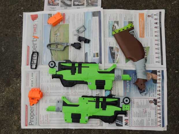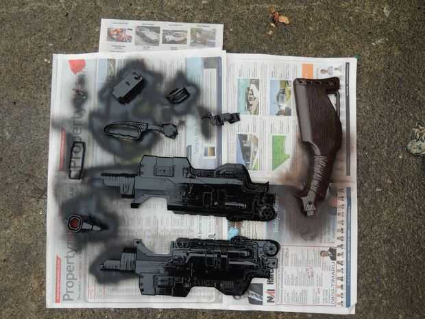 Establecer algún periódico sobre una superficie plana. (Nota. Asegúrese de que antes de empezar que no hay polvo de suciedad ha hecho su camino en el blaster de todos modos). Comience rociando golpes lentas y prolongada a lo largo de la blaster, prestando atención a pequeñas grietas y agujeros donde podía faltar. Esperar 20-30 minutos que se seque, luego repita el proceso otra vez. (Nota: ver que más no rociar el sobre marrón al negro, para evitar que esto les podría pintar en superficies distintas).