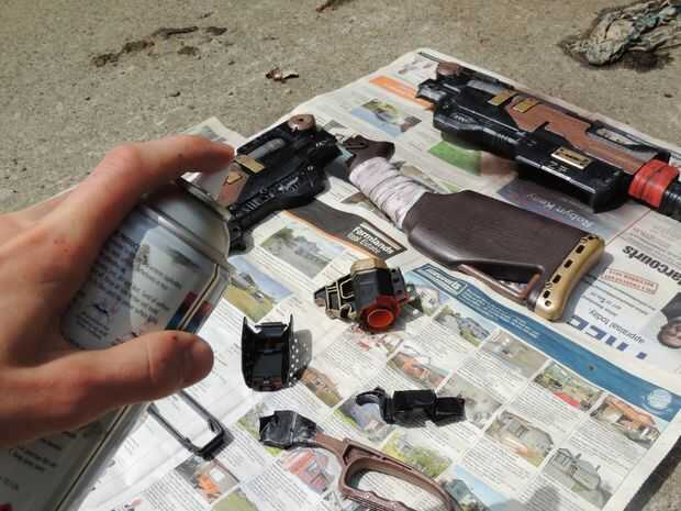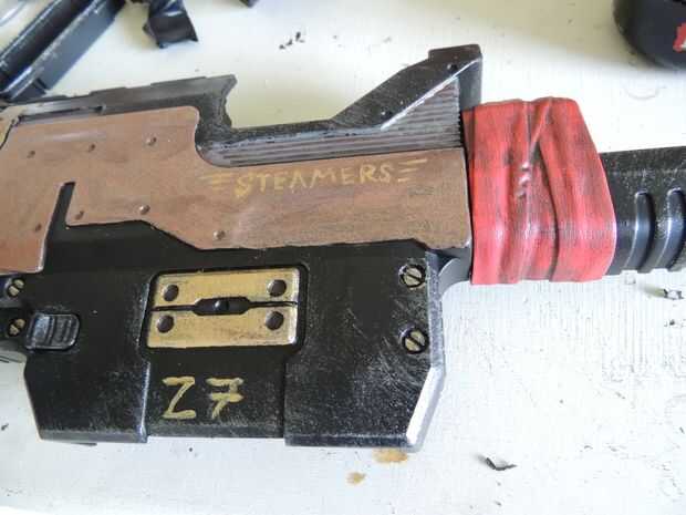 Ahoras el tiempo para poner cualquier final detalles para la construcción, en mi caso un logo de 'Vapor' y las cifras Z7. El proceso final de la construcción trata de una capa protectora, esto por supuesto es totalmente opcional, pero se lo recomiendo especialmente si usted planea en usar su blaster en todas formas. La misma técnica que rocía la primera capa se utiliza para esto.