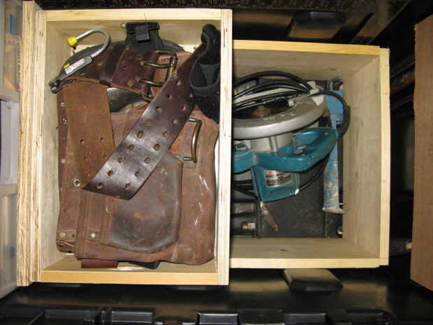 Inicio con el compartimiento de la parte inferior. La foto no lo muestra muy bien pero he utilizado 3/4 "x 8" pino para crear un cuadro. Esta zona es para las cuerdas y herramientas eléctricas. El borde del compartimiento mantiene las bandejas superiores.