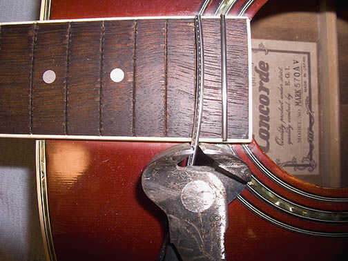 Simplemente puse el cable a través de la ranura de traste trastes y corte con mis pinzas justo en el borde. Usted necesita para cortar y forma estos cables uno a la vez porque cada ranura de traste es ligeramente menor (o mayor dependiendo de que te terminan de inicio), luego uno antes. Así que corte el cable, luego proceder a los pasos de la pareja, ven a este paso para el siguiente traste. ¿Entiendes?