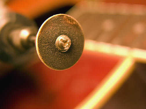 Ahora cambiar la rueda de corte para un disco de lija (Foto 2). Esto quitar pequeñas rebabas y ayudan a dar forma y redondo los extremos traste un poco más.