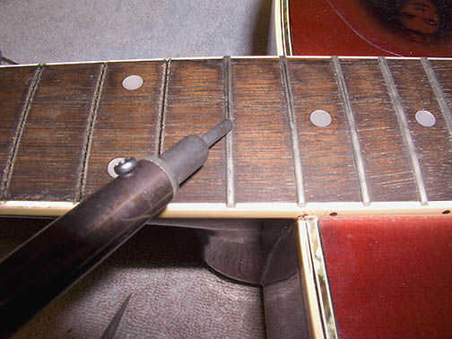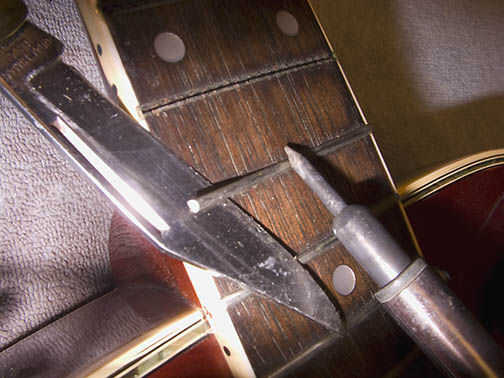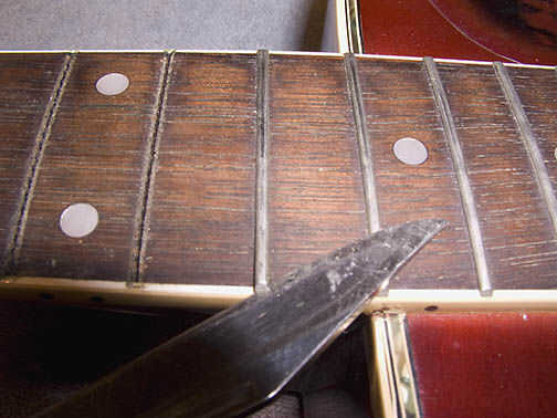 Coger un cuchillo de bolsillo, o algo similar a suavemente separe el traste de la Junta Directiva. Esto es bastante fácil de hacer... sólo tienes que ir poco a poco. Si eliminas el traste a rápidamente sin suficiente calefacción, el diapasón se astillen. Un poco de astillado es normal... pero trata de mantenerlo a un mínimo. Realmente, ir poco a poco. Tómate tu tiempo. ¿Le gusta su instrumento no?