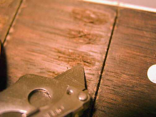 Tomar su maquinilla de afeitar y 'levantar' los cortes que acaba de hacer en el cincel. La idea aquí es hacer astillas, sin romperlos apagado (aunque se rompa una pareja), para crear una red de fibras de madera. He intentado subir las astillas al nivel de los trastes. Una vez más, ir