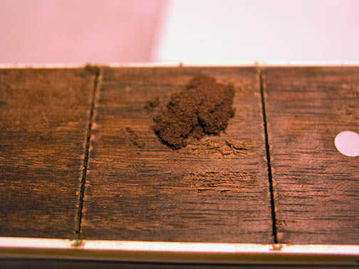 Así que toma tu pedazo de papel con el polvo en él y golpee suavemente el polvo sobre su tablero del traste.