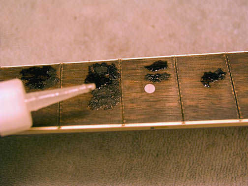 Por lo tanto, gotear el pegamento en polvo envasado. El pegamento se mecha hacia abajo a través del polvo y las astillas y crear el relleno perfecto para las gubias. Como el pegamento reacciona con el polvo puede fumar! No se alarme. Este tipo de pegamento genera calor. Ver otra vez, sus dedos, ojos y nariz.