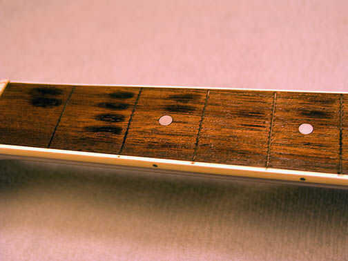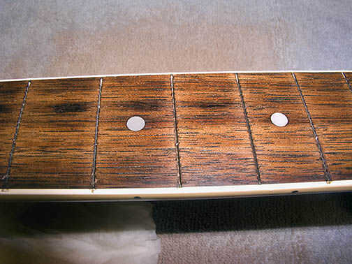 Cuando se hace el cincel puede ser un color ligeramente diferente que su diapasón original... pero oye el diapasón con ser como nuevo otra vez. Usted puede conseguir un palo de color más ligero que su tablero y luego cuando se aplica el pegamento podría coincidir con mejor. De todos modos, la imagen 2 º y 3 º en el paso de hacer los rellenos parecen mucho más oscuros de lo que realmente son. En persona, tienes que mirar de cerca para ver donde llena mis trastes.