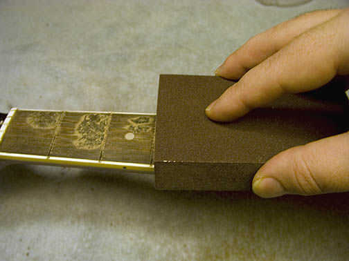 Cuando termine de lijar, tomo un paño húmedo y limpie el polvo. Luego toma un paño de algodón suave y se usa para frotar aceite mineral en el tablero del traste entero. Esto podría hacer un par de veces para dejar que el aceite filtre en la madera. Cuando haya terminado debe parecerse pic #2 y #3 en este paso.