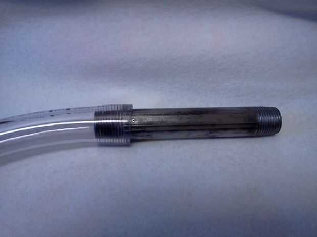 - Deslice el tubo de vinilo 3/4 de pulgada sobre la tubería de acero hasta topar con el acoplamiento del PVC. Jabón o aceite pueden ayudar pero no son necesarios. Este paso es más tiempo consumiendo ya que es un ajuste muy apretado