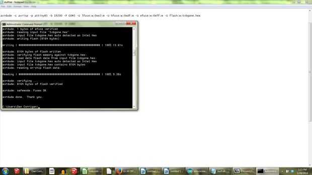- una vez que se introduce el texto presiona enter y aparecerá un montón de texto de. Al final debería decir avrdude hecho gracias! Si no Revise las conexiones, el puerto com y si el texto está escrito en correctamente.