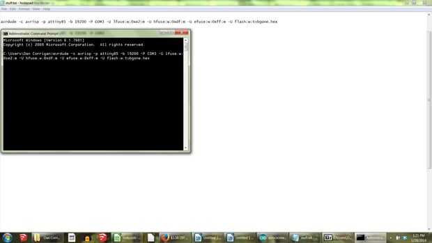 AVRDUDE - c avrisp -p attiny85 -b 19200 - P COM3 - U lfuse:w:0xe2:m - U hfuse:w:0xdf:m - U efuse:w:0xff:m - U flash:w:tvbgone.hex