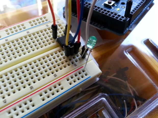- Un LED conectado entre el pin 7 y tierra debe destellar cuando está encendido.