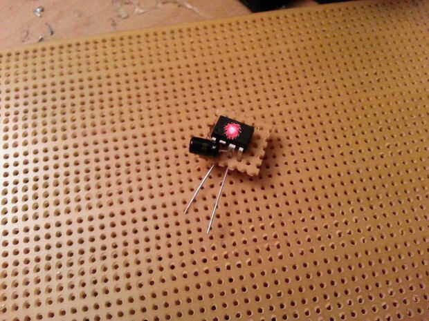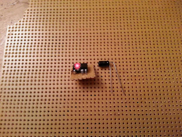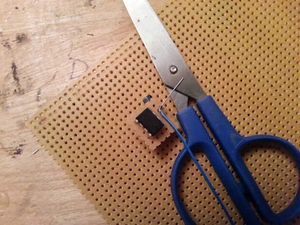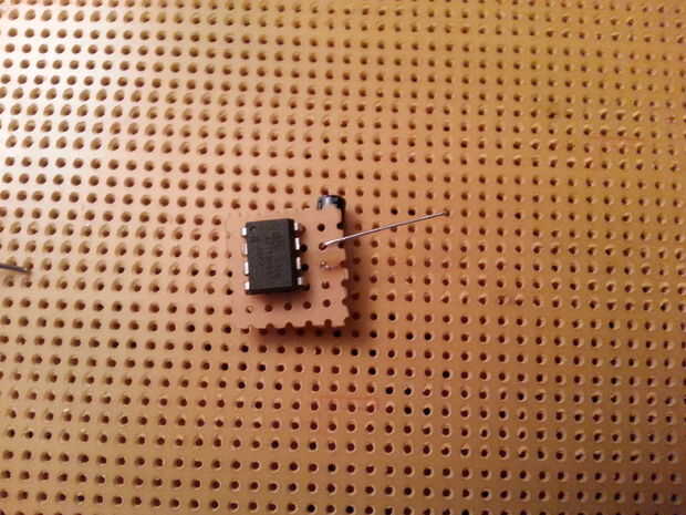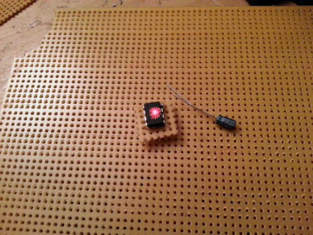 Añadamos un condensador a la mezcla para la diversión. Se sienta en el mismo lado que el circuito de audio con el doblado de pata larga y conectado al pin 3 del chip de sonido con un poquito de soldadura.