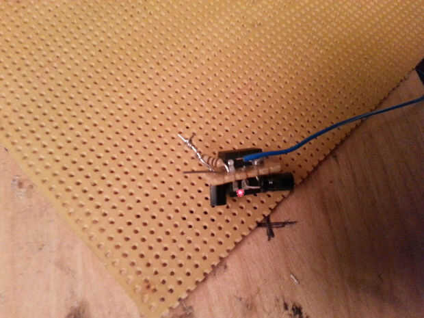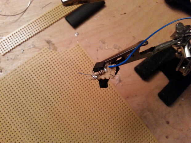 Un nuevo cable (2-3 pulgadas) (mina son de color blanco) está conectado a la pata del transistor más cercano al cable azul.