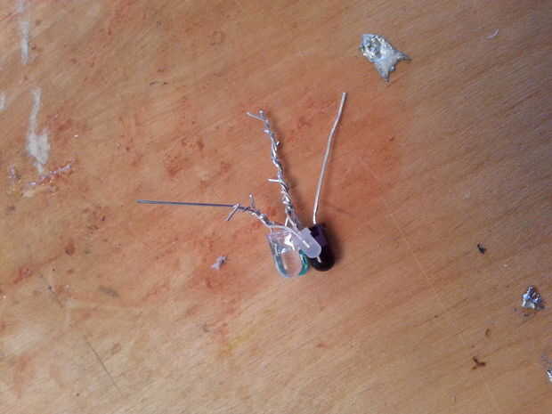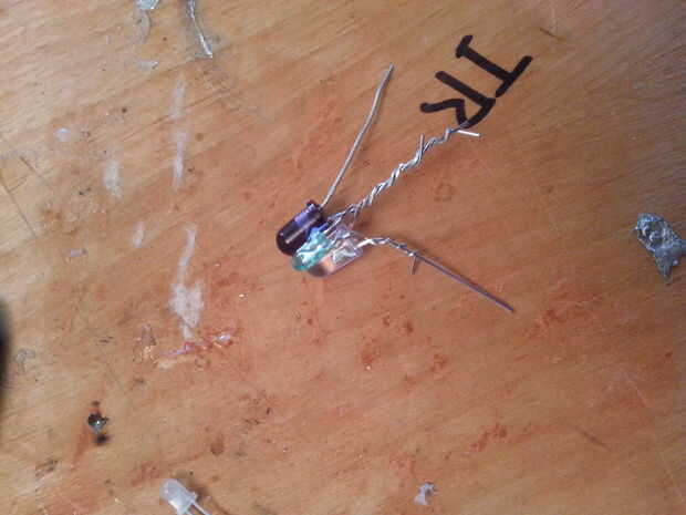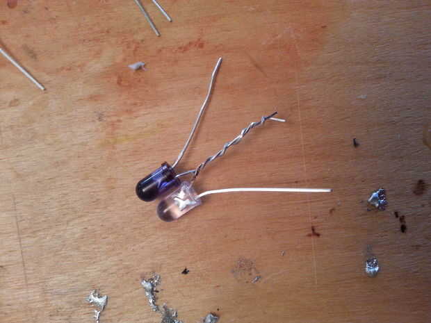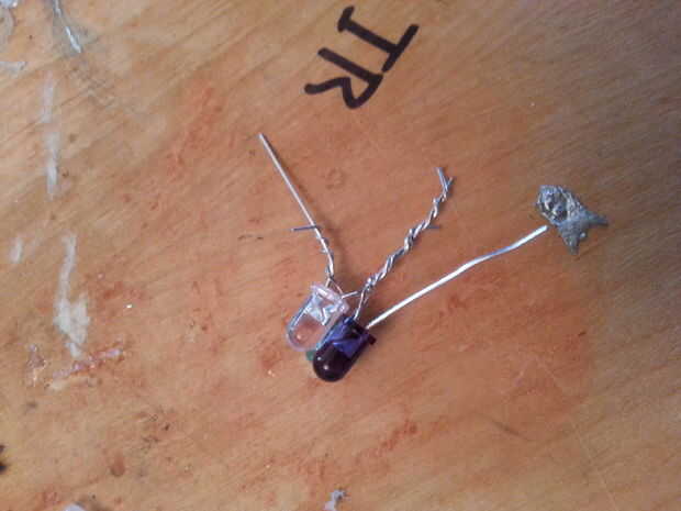 Tomar el LED verde, envuelva la pata positiva alrededor de la pata positiva de la UV led y la pata negativa alrededor de la pata negativa del LED UV