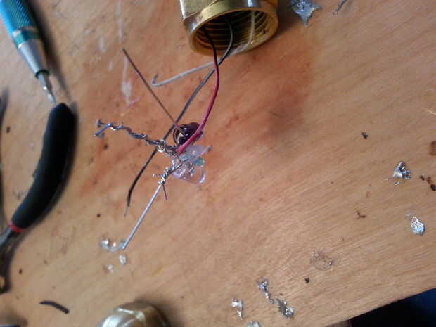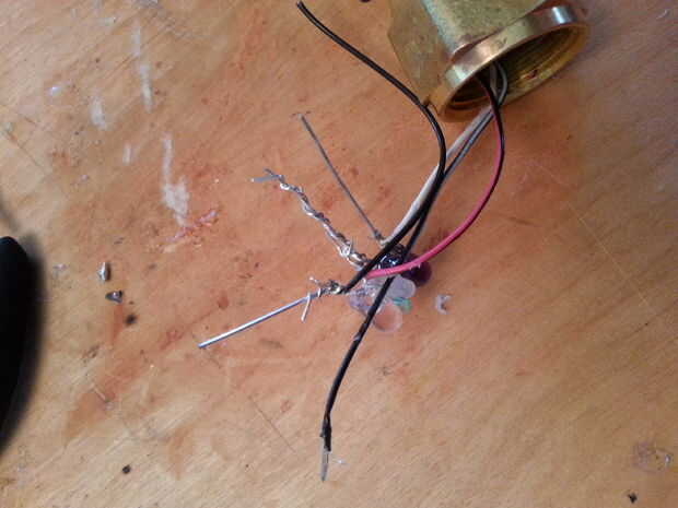 Envuelva el cable rojo de la parte superior del microcontrolador (el lado con 4 cables) alrededor de esta masa central de piernas positivo