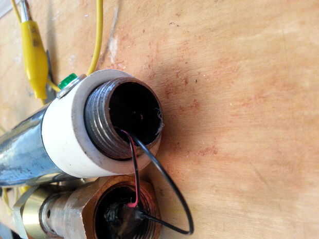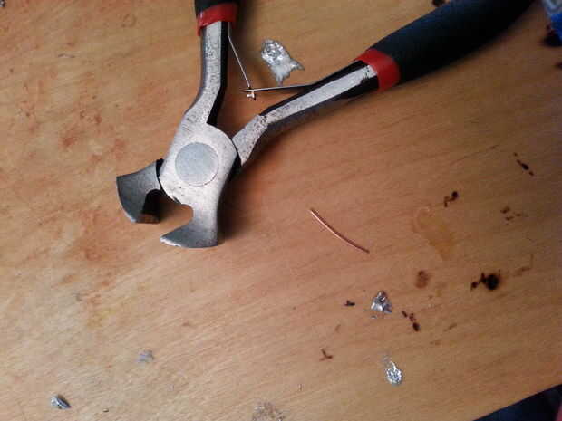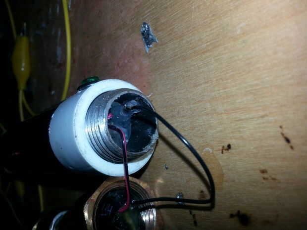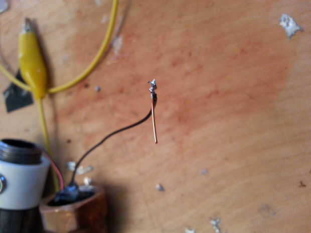 El fragmento de cable de núcleo sólido de la soldadura al cable negro desde el microcontrolador. Empuje el fragmento de alambre de alambre sólido a lo largo del lado de la manija entre él y el pegamento caliente. A prueba.