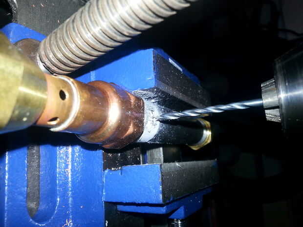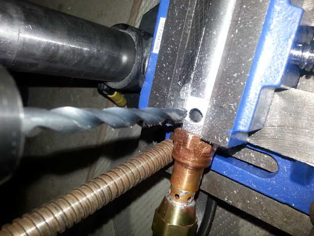 • Coloque el tubo en una prensa de taladro con la marca hacia arriba. Use el adaptador para encuadrar la cara a la prensa