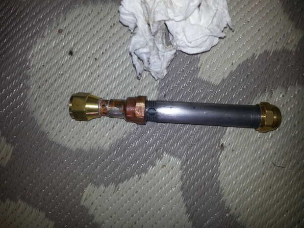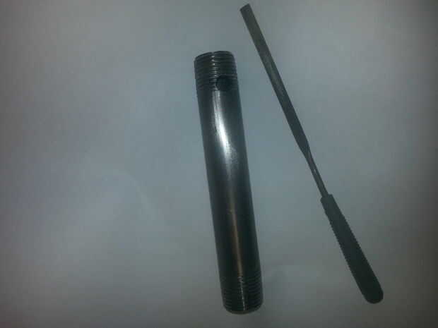 Hay dos modificaciones que tienen que pasar a la 1/2" por 5" negro tubo de acero para este proyecto: perforación de un agujero para el botón y el residuo de pintura de aceite desde el exterior de la tubería de limpieza.