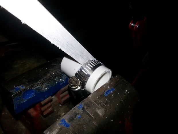• Utilice una sierra para cortar a través del acoplamiento de pvc utilizando la abrazadera de la tubería como guía