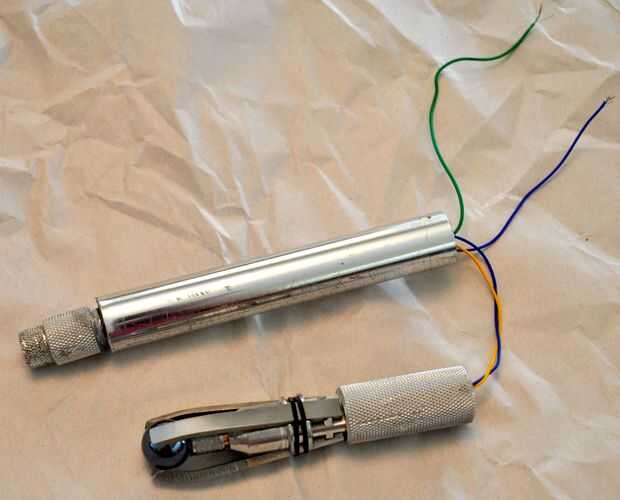 El compartimento estaba caliente pegado al ras con el extremo del tubo añadir aproximadamente la mitad de la cola alrededor del puntero láser y sosteniendo en su lugar mientras haya enfriado el pegamento. El otro lado luego fue rellenado.