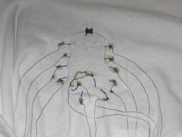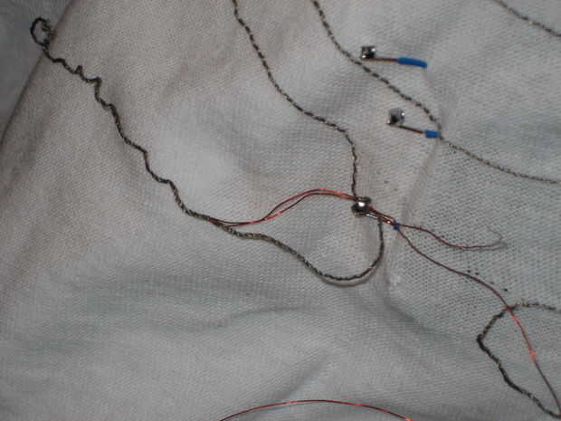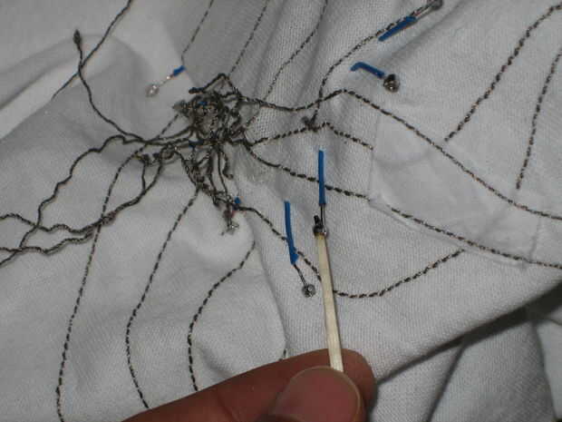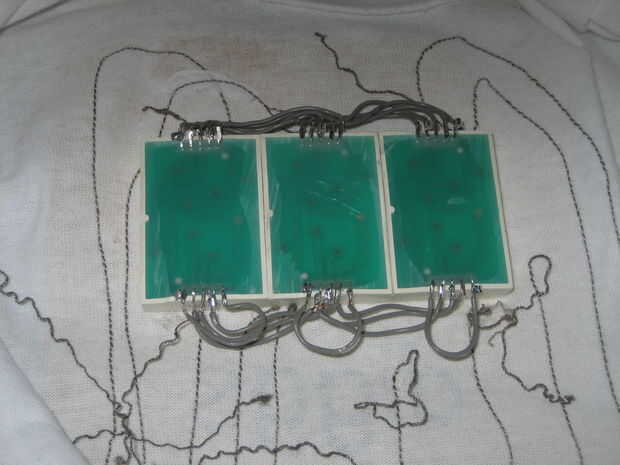 Usé una idea que leí en la Página Web de Leah Buechley donde que prensan los granos fueron soldados a LEDs y luego enhebrados con el hilo conductor. El mismo principio fue utilizado aquí en el display de 7 segmentos y en el botón de digg PCB.