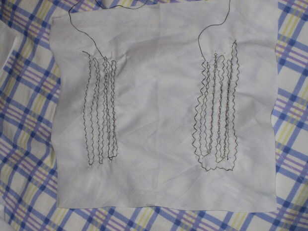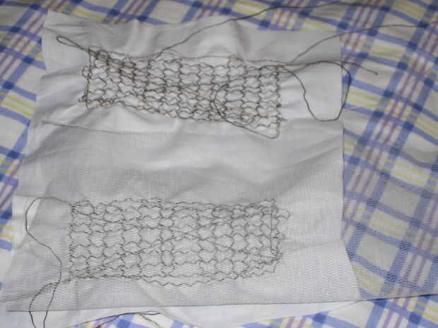 No tengo ninguna tela conductora, por lo que el hilo conductor fue cosido a la tela de la cubierta, dos pedazos de red de nylon se utilizó para separar la tela como parecía la mejor.