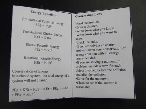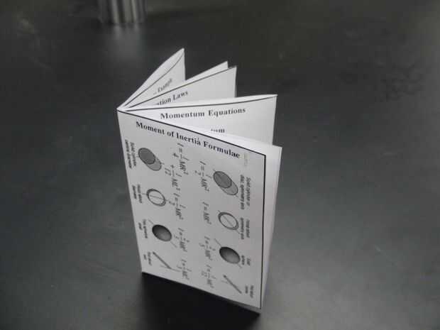 La referencia que proporcionan los estudiantes a utilizar durante el proyecto es una sola página que se dobla en la forma de un mini libro. Hacer estos pequeños libros para cada uno de los temas importantes que enseño, esta contiene material sobre la conservación de la energía y mecánica de rotación incluyendo las fórmulas de varios diferentes momentos de la inercia.