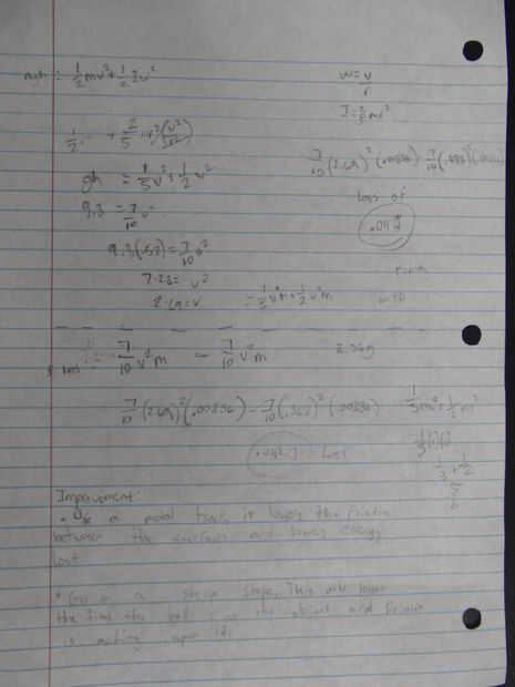 Después de su investigación, los estudiantes completan sus cálculos para la pérdida de trabajo y energía cinética entre el diseño original y su rediseño. Un ejemplo de cálculos de estudiante se incluye en la foto. Es interesante ver cómo poca energía se pierde cuando los estudiantes estabilizan sus pistas y afloje curvas para reducir la fricción en las vueltas.