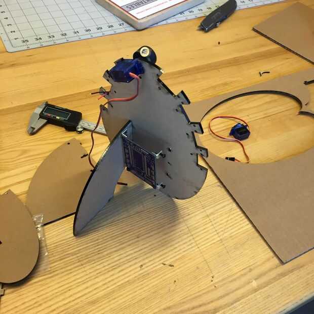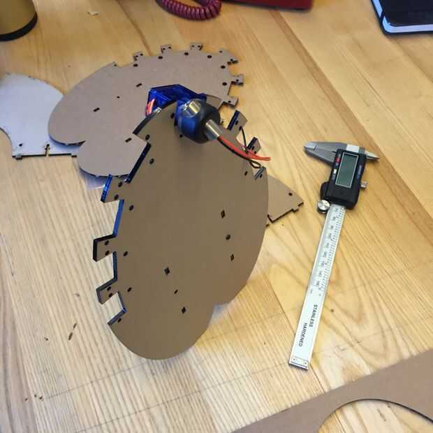Una vez que la placa y las piernas fueron diseñadas, prueba-corte les de cartón utilizando un cortador láser para comprobar dimensiones. El modelo de micro servo fue preciso para servo ranuras y agujeros alinean precisamente, siempre una buena sensación! Luego cortar la placa y las piernas de acrílico y ensamblada en seco para comprobar el acoplamiento de la ficha y captura del tornillo. También prueba-instalé un servo con montaje de láser y láser para comprobar distancias, compruebe! Todo cabe en el primer intento, que algo las horas que pasó en Inventor.