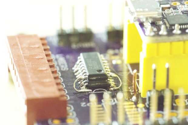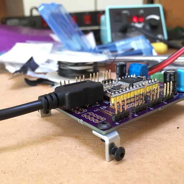 Una vez tuve el PCB terminado, era un asunto sencillo para "rellenar", o así que pensé! Sólo tiene unas pocas piezas y conectores, ¿qué tan difícil podría ser? Bien un par meteduras de conjunto me un poco hacia atrás, pero se probó nada catastrófico. Había un montón de conectores, incluyendo ocho cabeceras de servo de 3 pines. La imagen superior muestra mi truco para soldar cuatro de las personas a la vez: para mantenerlos rectos y alineados pegado en un protoboard solderless entonces poner el PCB para soldar las patillas de la cabecera. Esto significa que usted necesita alinear todos los conectores en un. 1" red al diseñar el PCB, generalmente una buena idea así que usted puede apilar un perfboard en la parte superior si necesita añadir o rehacer las cosas.